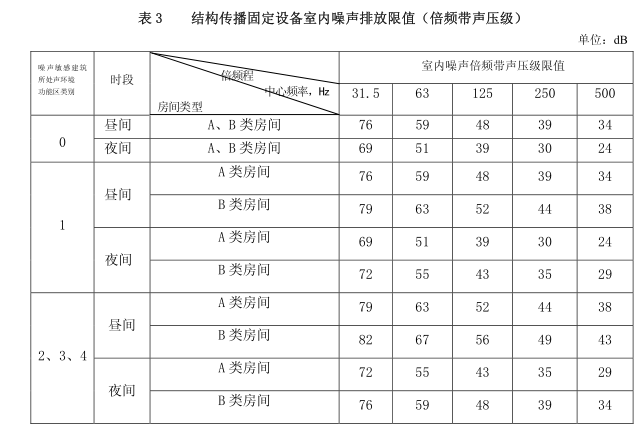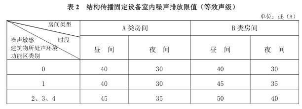 當固定設備排放的噪聲通過建筑物結構傳播至噪聲敏感建筑物室內時,噪聲敏感建筑物室內等效聲級不得超過表 2 和表 3 規定的限值。